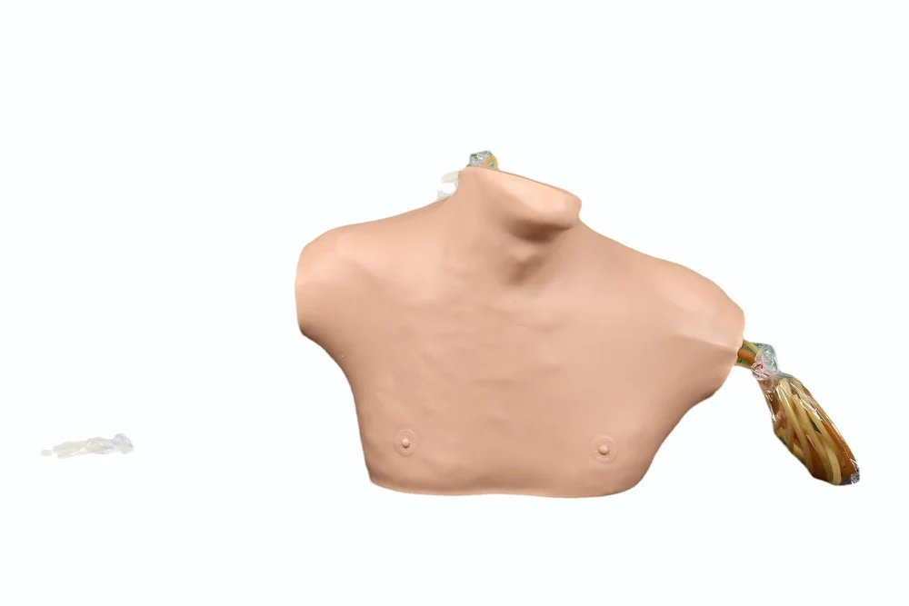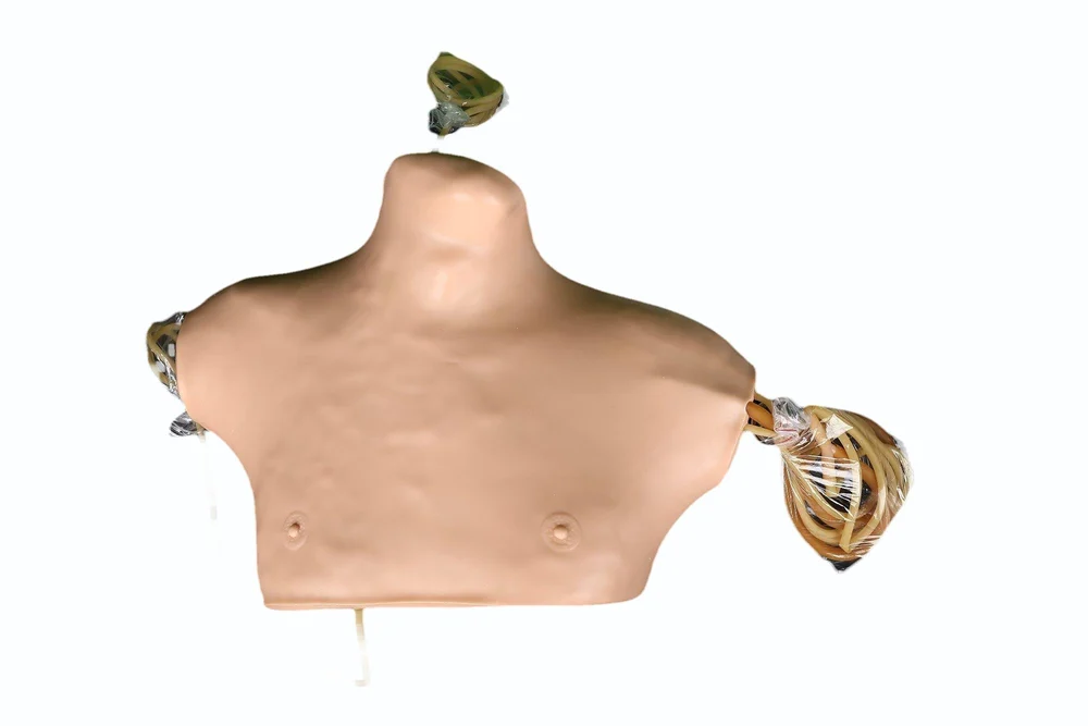 The cervicular veins are filled with red simulative blood for internal jugular vein and subclavical vein puncturing use. Squeeze bulb can simulate carotid artery pulse. With accurate anatomy, palpation is exactly the same as on a patient. Replacing of the internal tubing and skin is extremely easy.