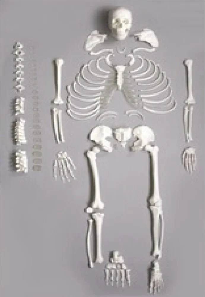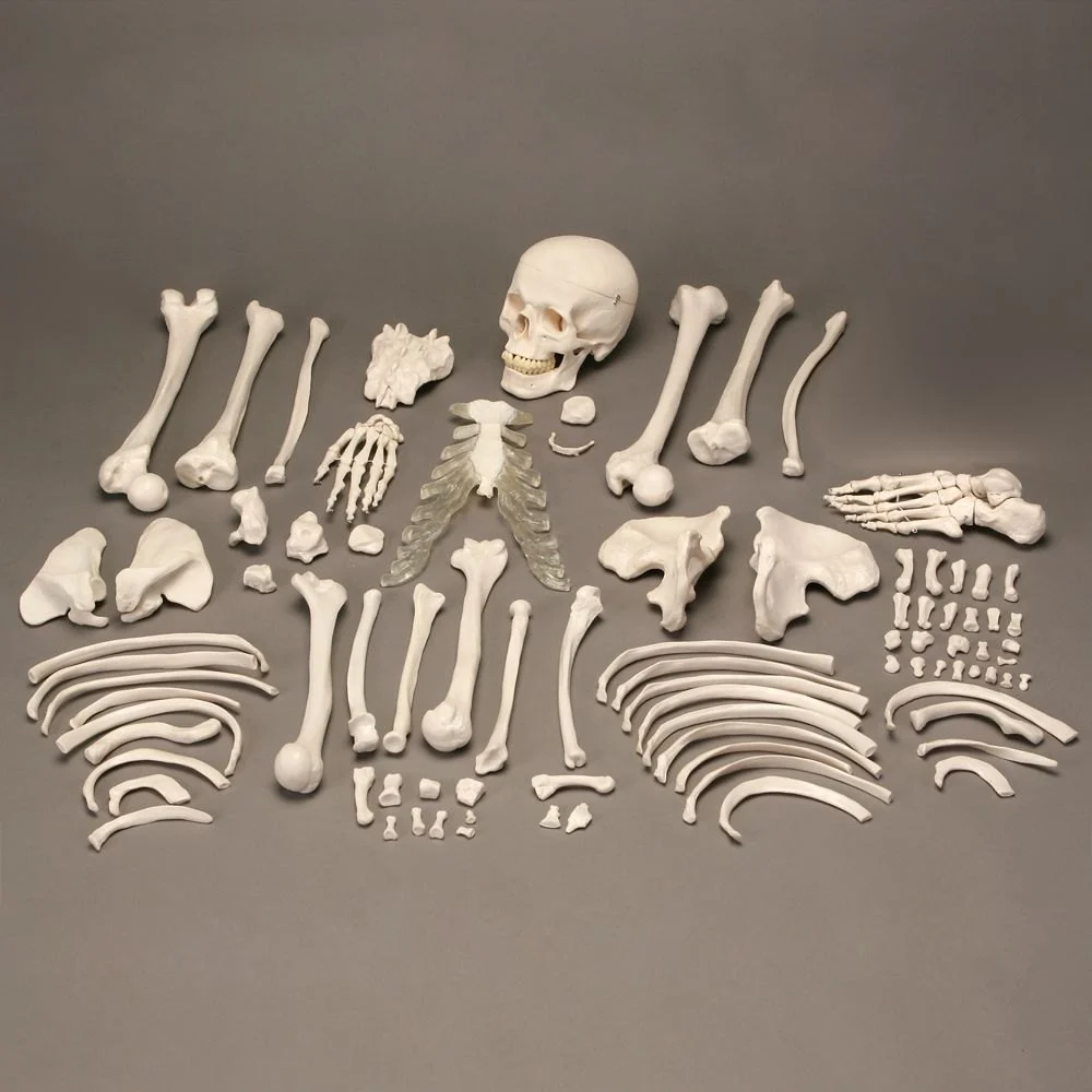 Life-size, disarticulated adult skeleton includes 3-part skull, right hand and right foot on wire.