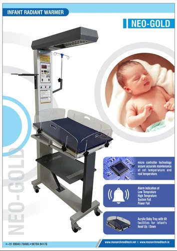 • Three Selection Mode : Servo/Manual/Prewarm Selection modes.• Air/Skin Servo Controlled System.• Acrylic Baby Tray with tilt facilities for infant’s hea‹l Up / Down.• micro controller technology assure accurate maintenance of set temperature and real temperature.• Bar graph LED Indicator for Heater power.• Manual setting of heater output with 5% resolu\ion in manual fnode.• Alarm indication of Low Temprature, High Teiziprature, System Failer, Power Failer, Temeprature Prob failure.• Key Pad Lock Facility to avoi4 accidental changes ol any set parameters.• Mute / Unfnute Facility of alarm.• Easy access of an infant froizi all sides due to clear acrylic collapsible side panel.• Instrument trey, Pole for infusion pump & IV Stan4.• Parabolic reflector to send uniform heal to baby cradle.• Self-test System.• User friendly leather Keypad.