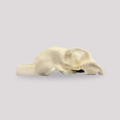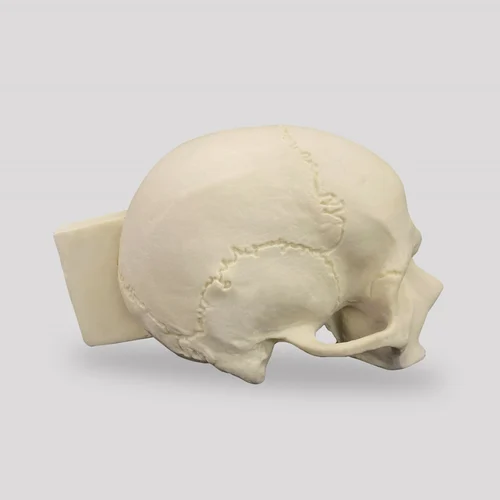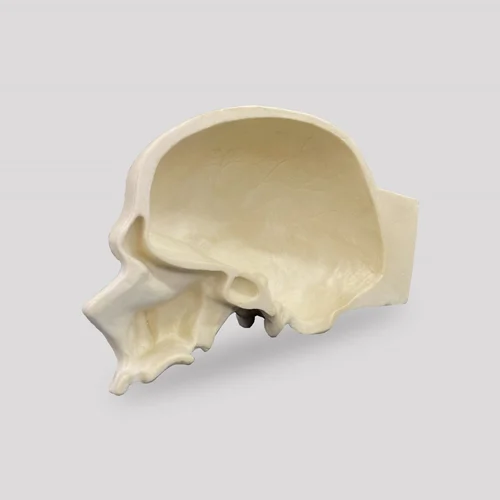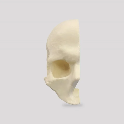 Right side of the skull cut longitudinally, edentulous, with internal details of the maxillary sinus and frontal sinus, allowing a detailed visualization of the internal anatomy. It has a support block for fixation in a vise (code 5027) during procedures. Manufactured with mechanical properties similar to human bone, it is ideal for use in hands-on practical classes or e-learning and workshop.