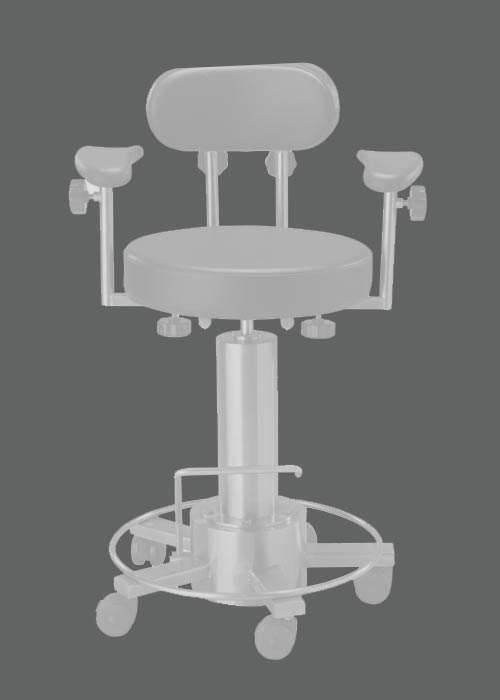 The surgeon can adjust the height electrically using a foot switch, with a range from 20” to 28”. Designed for comfortable microscope use while seated, it features height-adjustable and detachable armrests, as well as an adjustable backrest with vertical and horizontal movements. The stool has full swiveling castors for easy mobility, with optional brakes. It includes a fully upholstered seat and stainless steel parts. Armrest customization is available as an optional add-on.