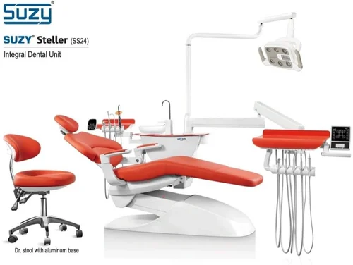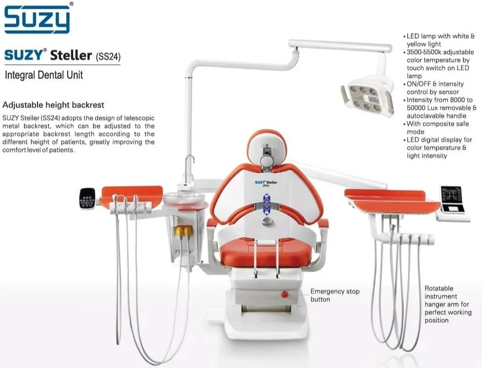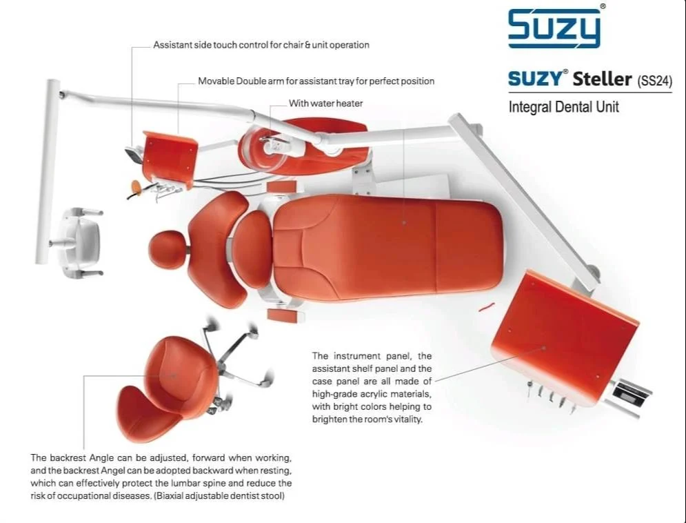 Suzy Stellar Integral Dental Unit : Adopts the design of telescopic metal backrest,which can be adjusted to the appropriate backrest length according to the different height of patients,greatly improving the comfort level of patients,Touch system for main controller with 9 program for chair,LED lamp with white & yellow light,3500-5500k adjustable color temperature by touch switch on LED lamp,On-off & intensity control by senssor ,Intensity from 8000 to 50000 Lux removeable & autoclavable handle with composite safe mode, LED digital display for color temprerature & light intensity,Emergency stop button,Rotable instrument hanger arm for perfect working position,The instrument panel,the assistant panel and the case panel are all made of high-grade acrylic materials,with bright colors helping to brighten the rooms vitality , Moveable unit to create more space for 4 handed density treatment,Triangular unit box design give more legroom for assistant,Synchronized movement of backrest and seat for patient comfort,right side handle moveable,Adjustable headrest,Detachable suction filter,Senssor system for automatic start to add water for cup & gravity senssor cut off water automatically as soon as water reach 160ml,Autoclable silicon pad for instrument tray & for assistant tray,foot control with water switch on-off blow air tumbler/spitton on-off,Imported material tubes italy solonoid valve/TMOTION motor or Linark (Denmark),Detachable cushion,Assistant tray made by acrylic material,Biaxial adjustable dentist stool.